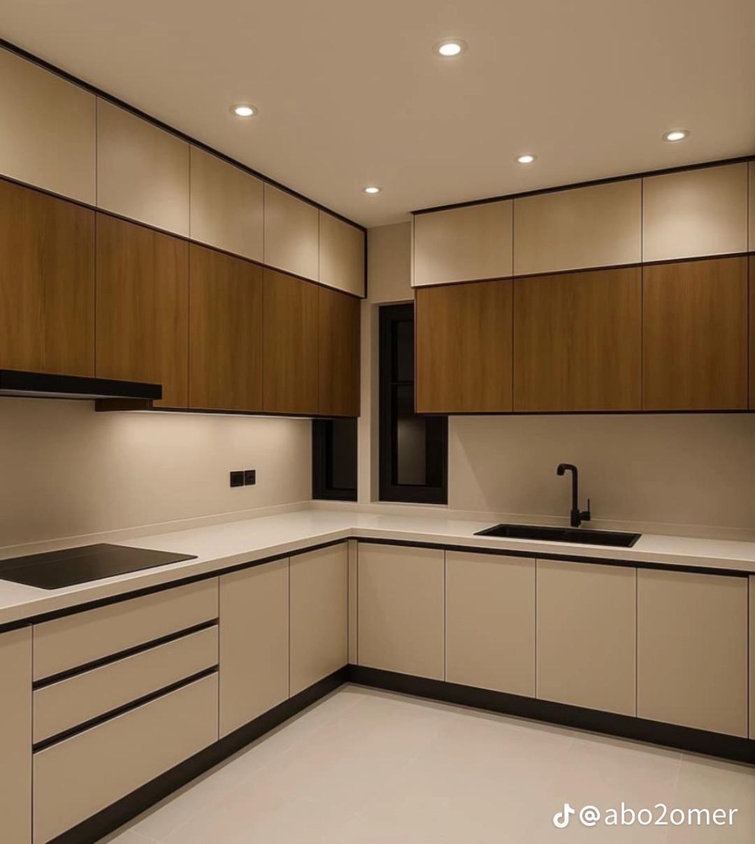 تصميم ذكي وعملي يتناسب مع المساحات المتوسطة والصغيرة، يعتمد على توزيع الوحدات بشكل حرف L ليوفر سهولة الحركة واستغلال الزوايا بفعالية. مثالي للمطابخ المفتوحة، ويمنحك مساحة مريحة للعمل والتخزين.